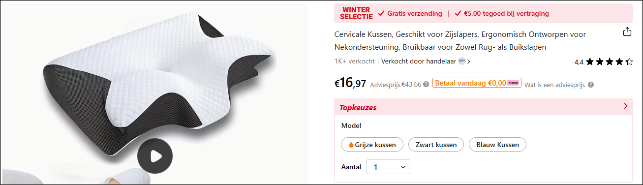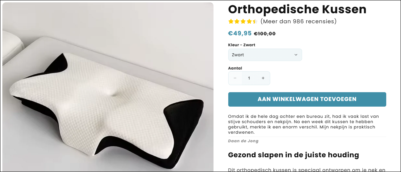 Hieronder zie je een Orthopedisch hoofdkussen dat door een droppshipper te koop aangeboden wordt op facebook voor € 49,95 en het is nog afgeprijst van € 100,- dat dit een onzinverhaal is wordt bewezen door de prijs van exact hetzelfde Orthopedisch kussen op Temu.